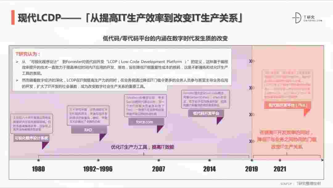 2020年前后,,,源于提高IT工作者开发效能的LCDP不断进化和衍生,,,面对业务导向日益明显的数字化变革。。。LCDP衍生出了面向不同对象的升级服务——面向专业人群的LCDP和业务人群的NCDP,,LCDP与NCDP的不同服务属性被逐渐认可和接受。。。 LCDP在提高IT开发效率的同时,,,,降低IT与业务之间协同的门槛改变IT生产关系。。